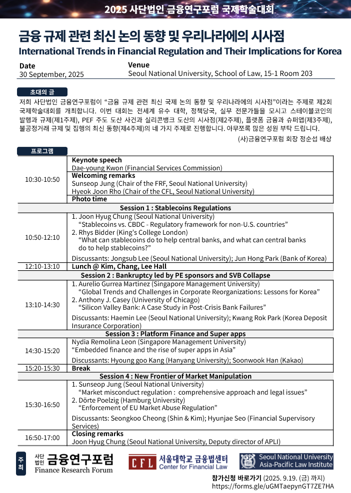 The Asia-Pacific Law Institute of Seoul National University (Director Prof. Jong-ik Chon) held an academic conference entitled "International Trends in Financial Regulation and Their Implications for Korea" on Tuesday, September 30 with Center for Financial Law and Finance Research Forum.