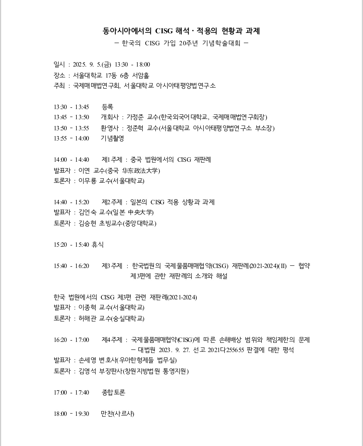 The Asia-Pacific Law Institute of Seoul National University (Director Prof. Jong-ik Chon) held an academic conference entitled "Current Status and Challenges of CISG Interpretation and Application in East Asia " on Friday, September 5 with Korean Research Group on International Sales Law (KRISL).