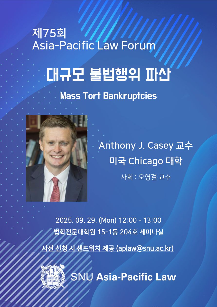 The Asia-Pacific Law Institute (Director Prof. Jong-ik Chon) held the 75th Asia-Pacific Law Forum on September 29th, 2025 (Monday), at the Institute's Seminar Room, 15-1, Seoul National University. The forum was moderated by Prof. WU Ying-Chieh and Prof. Anthony J. Casey gave a presentation on the topic of "Mass Tort Bankruptcies". Prof. Chung Joon Hyug, Prof. WU Ying-Chieh, Prof. Choi Joon Kyu, Prof. Lee Hye Min, Prof. Aurelio Gurrea Martinez(Singapore Management University) and students from law school participated in the forum and held a discussion and Q&A session.