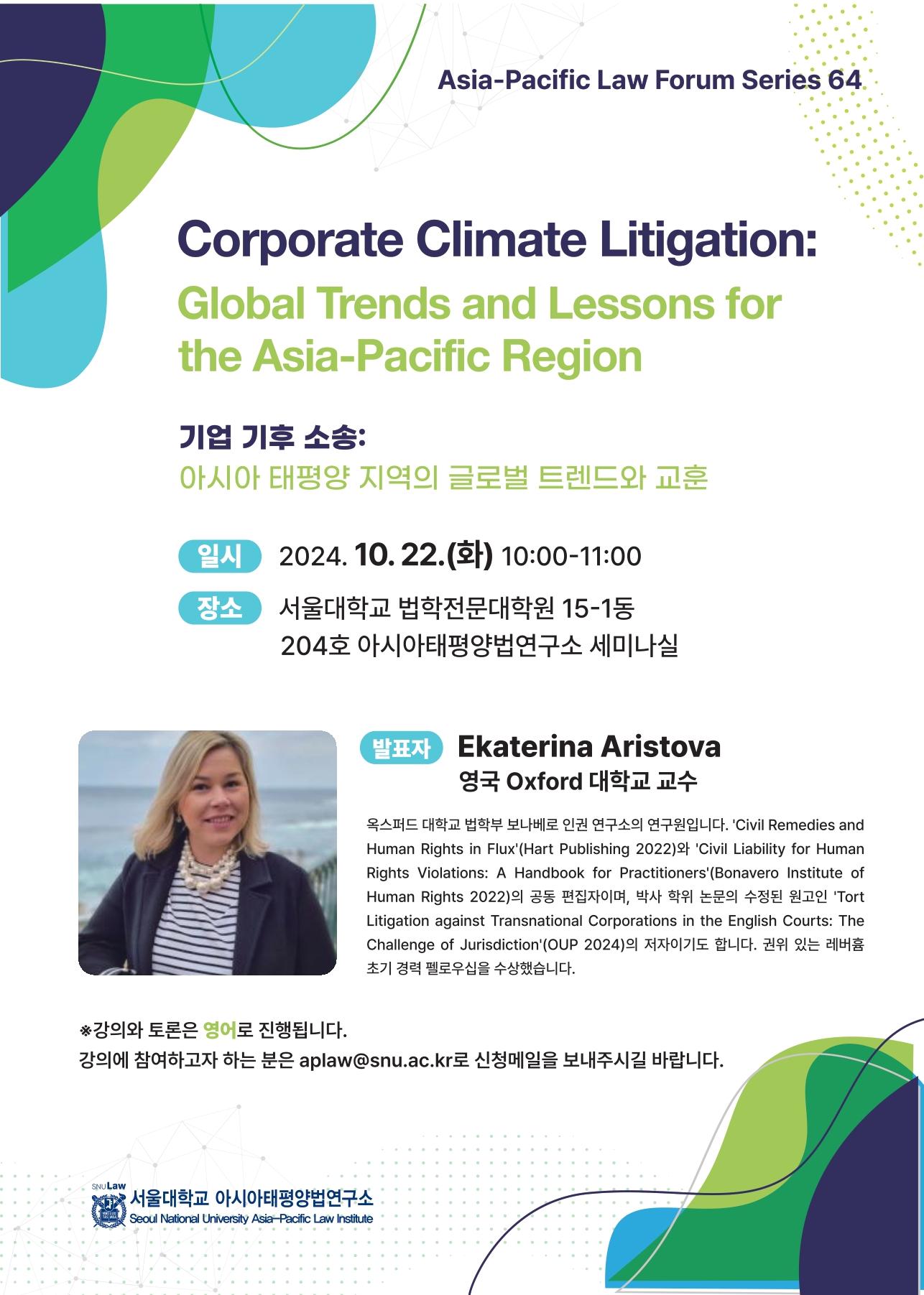 The Asia-Pacific Law Institute (Director Prof. Seongwook Heo) held the 64th Asia-Pacific Law Forum on October 22nd, 2024 (Tuesday), at the Institute's Seminar Room, 15-1, Seoul National University. The forum was moderated by Prof. WU Ying-Chieh, and Prof. Ekaterina Aristova from Oxford University gave a presentation on the topic of "Corporate Climate Litigation: Global Trends and Lessons for the Asia-Pacific Region". Director Prof. Seongwook Heo, Deputy Director Prof. Joon Hyug Chung, Prof. Guangwen Jiang, Prof. Woongjae Kim, Prof. WU Ying-Chieh, Prof. Jong Hyeok Lee, Prof. Kyung-Hoon Chun, lawyer and students from law school participated in the forum and held a discussion and Q&A session.